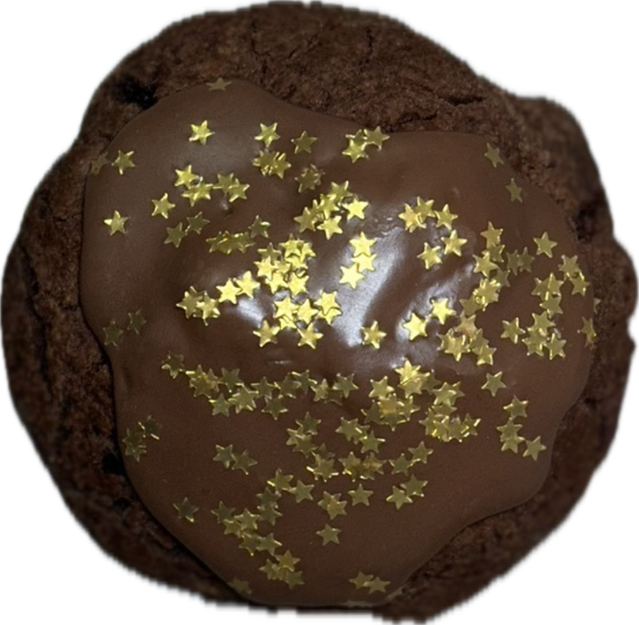 A dense, gooey brownie cookie baked thick and rich, topped with shimmering gold stars. Deep chocolate flavor with late-night vibes.